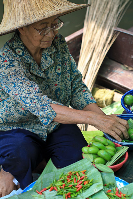 Woman sorting fruit and chillis at floating market, Bangkok, Thailand.