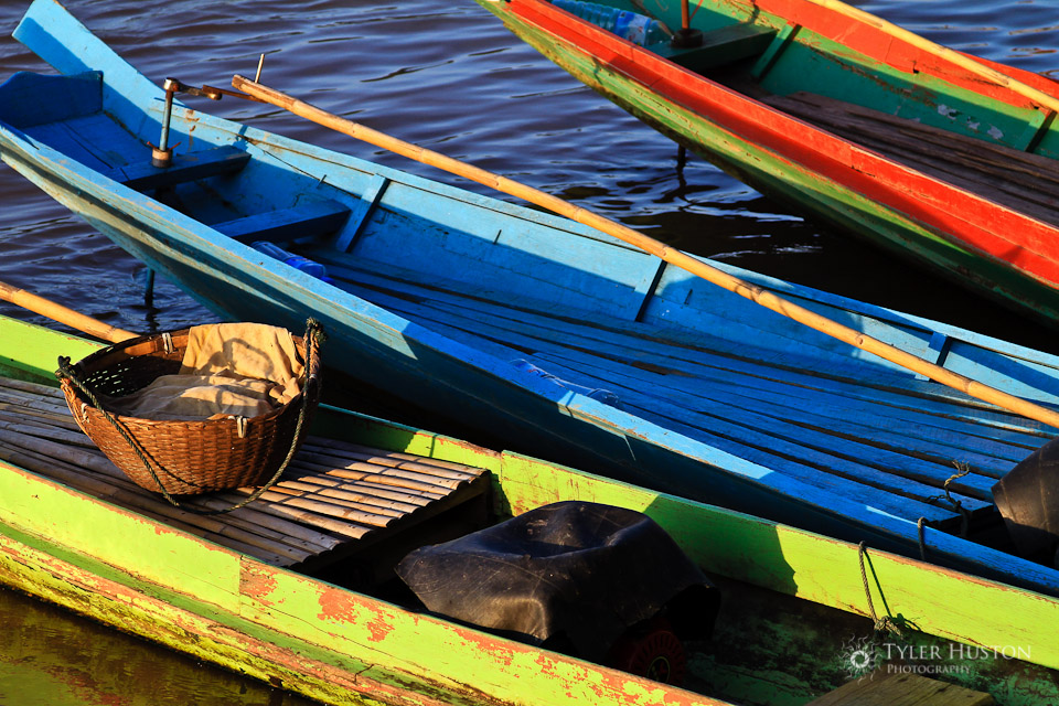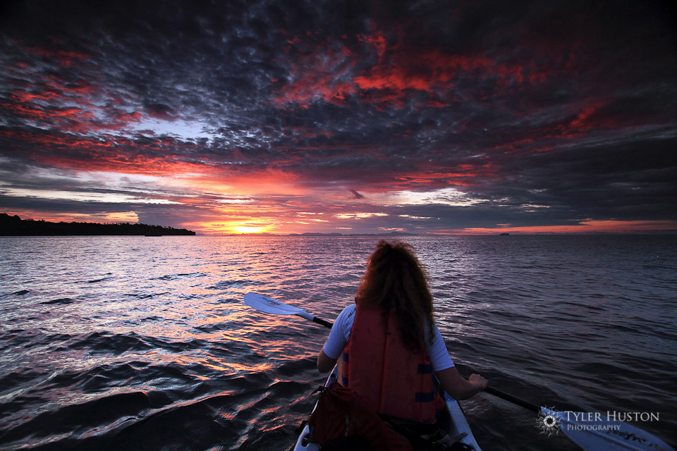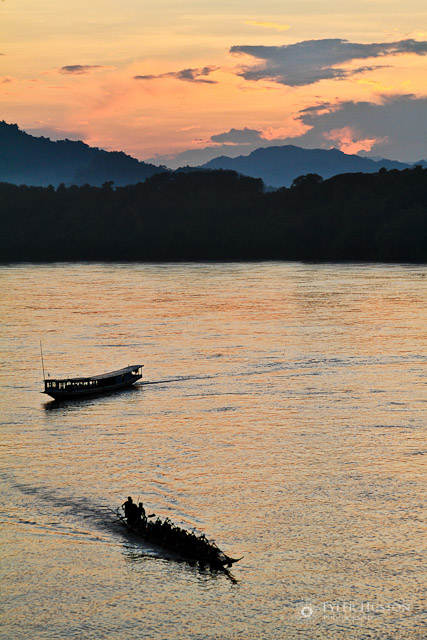 Mekong river sunset with paddlers